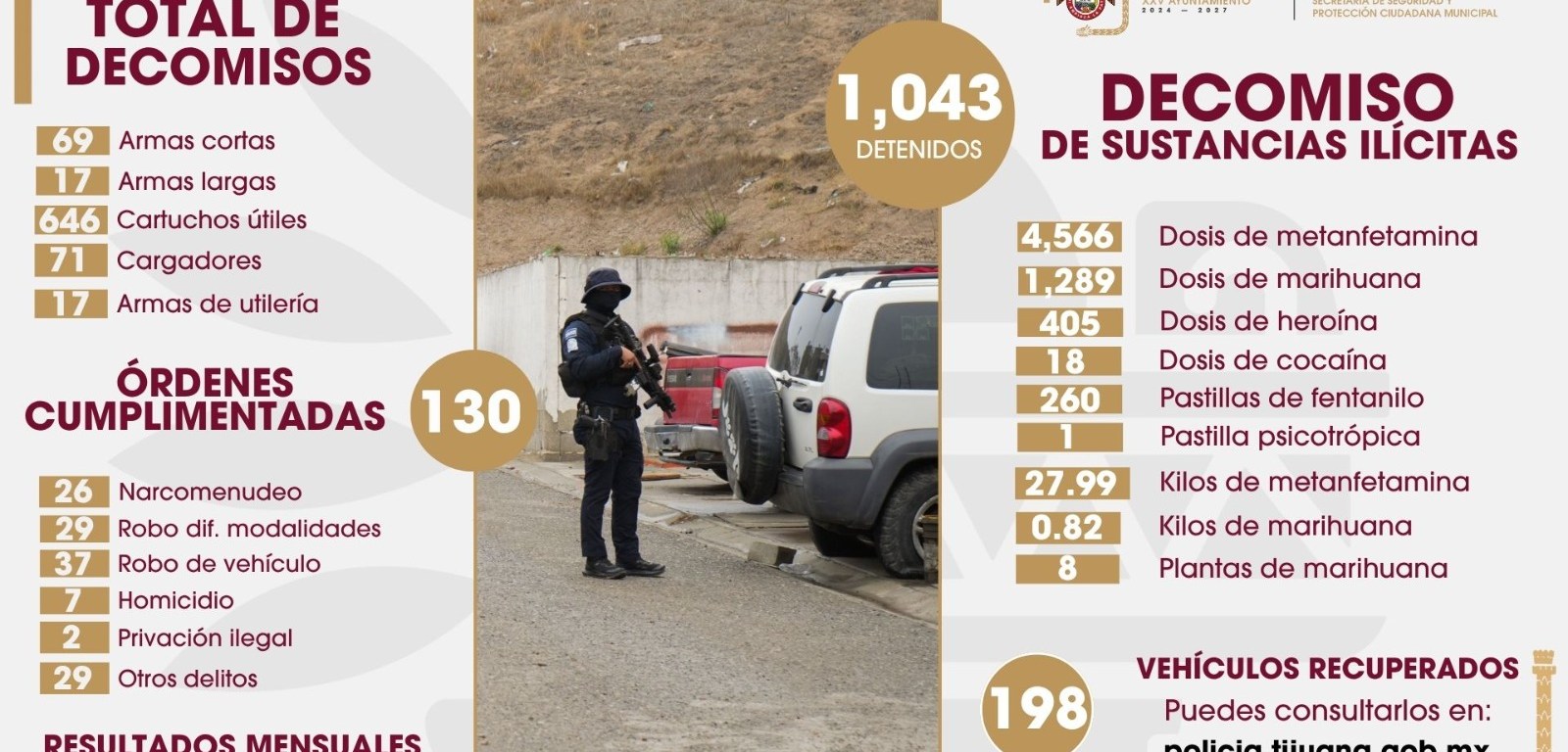 Asimismo, la acción decidida de los Policías Municipales ha permitido la recuperación de 198 vehículos reportados como robados, cuya información se encuentra disponible en la página oficial de la Policía Municipal de Tijuana, (policia.tijuana.gob.mx).