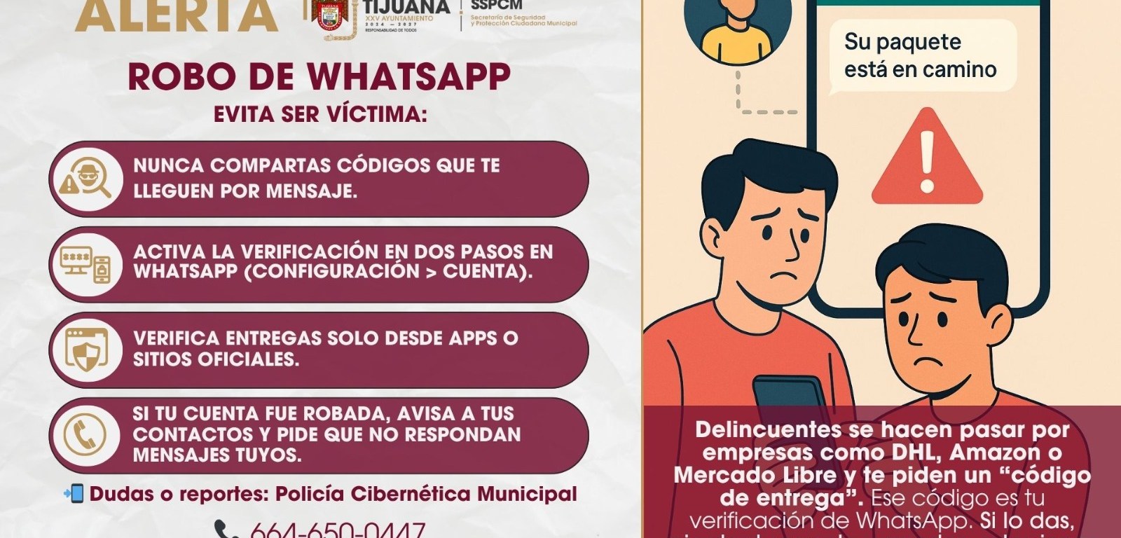 TIJUANA. La Secretaría de Seguridad y Protección Ciudadana Municipal, a través de la Policía Cibernética, hace un llamado a la ciudadanía para fortalecer su seguridad digital y evitar ser víctima del robo de cuentas de WhatsApp, delito que puede derivar en extorsiones, fraudes o suplantación de identidad.