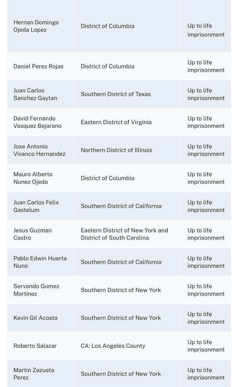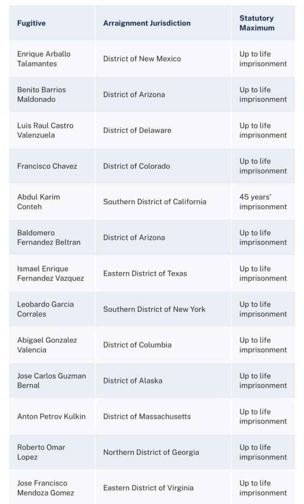 Las autoridades norteamericanas detallan que los 26 fugitivos enfrentan a una serie de cargos penales federales y estatales de todo el país, incluidos cargos relacionados con el tráfico de drogas, la toma de rehenes, el secuestro, el uso ilegal de armas de fuego, el contrabando de personas, el lavado de dinero, el asesinato de un ayudante del sheriff y otros delitos.