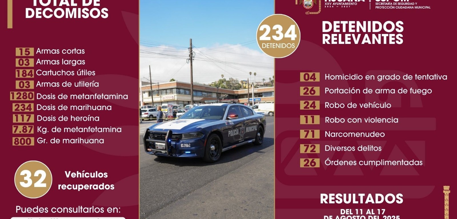 TIJUANA.-La Secretaría de Seguridad y Protección Ciudadana Municipal (SSPCM) informa que, durante la semana del 11 al 17 de agosto, se logró la detención de 234 personas presuntamente implicadas en diversos delitos, como parte de las acciones intensificadas para garantizar la seguridad y la paz en la ciudad.