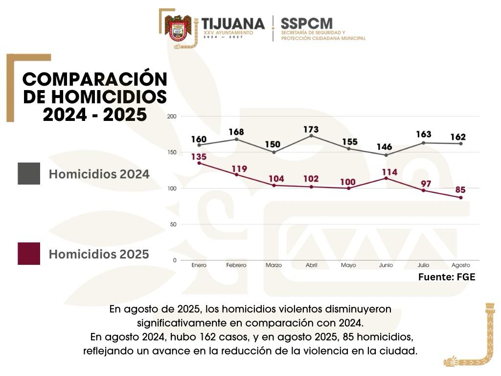 Tijuana, Baja California a 2 de septiembre del 2025.- El gobierno del presidente municipal, Ismael Burgueño Ruiz, a través de la Secretaría de Seguridad y Protección Ciudadana Municipal (SSPCM) reporta un avance significativo en la reducción de homicidios dolosos en Tijuana, alcanzando una disminución cercana al 50 por ciento, durante el mes de agosto, en comparación con el mismo mes del año anterior.