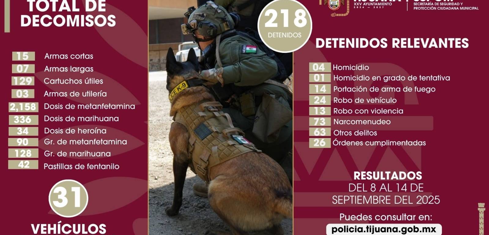 TIJUANA. La Secretaría de Seguridad y Protección Ciudadana Municipal (SSPCM) llevó a cabo una serie de acciones preventivas y reactivas en respuesta a denuncias ciudadanas que permitieron la captura de 218 personas consideradas presuntas responsables de diversos delitos. Además, de lograr el decomiso de 22 armas de fuego y cantidades significativas de sustancias prohibidas en el periodo del 8 y el 14 de septiembre.