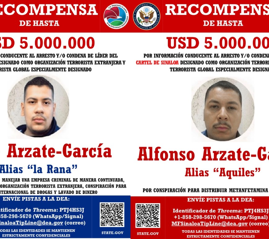 El Departamento de Estado de Estados Unidos anunció recompensas de hasta 10 millones de dólares por información que lleve al arresto y/o condena de dos presuntos jefes de plaza del Cártel de Sinaloa en Tijuana, identificados como René Arzate-García, alias “La Rana”, y su hermano Alfonso Arzate-García, alias “Aquiles”. Continúa leyendo Estados Unidos ofrece recompensa por los Hermanos Arzate