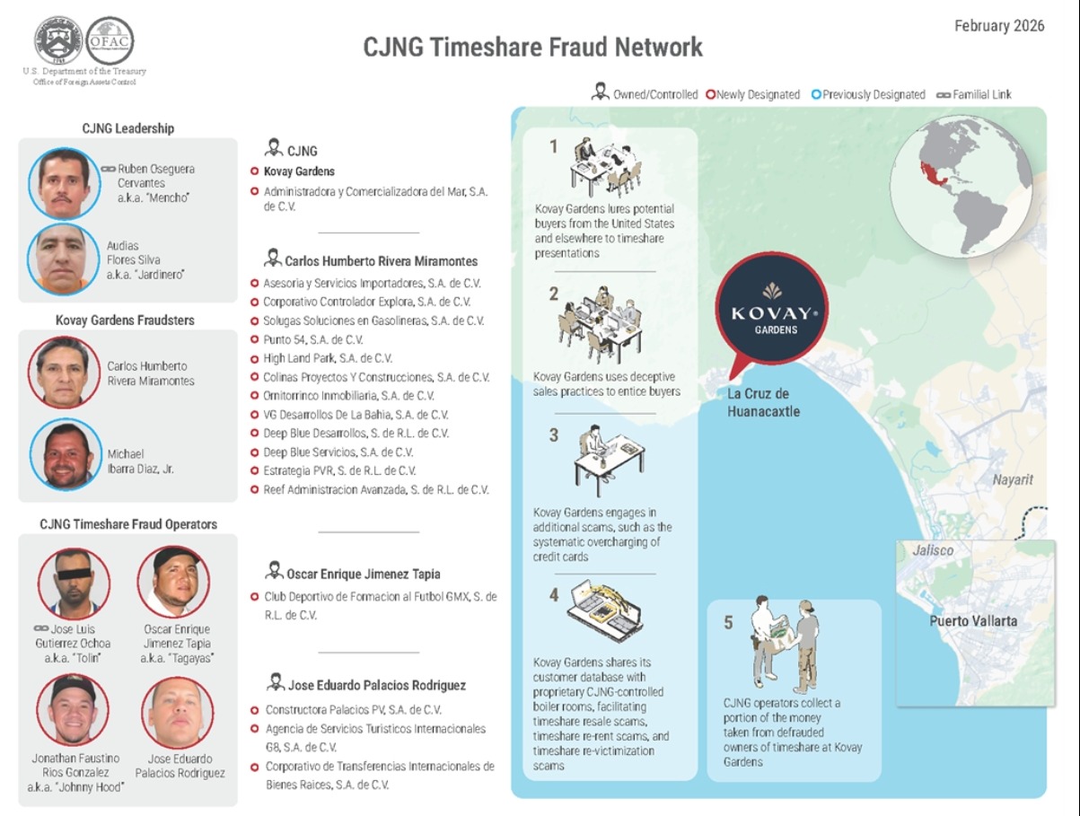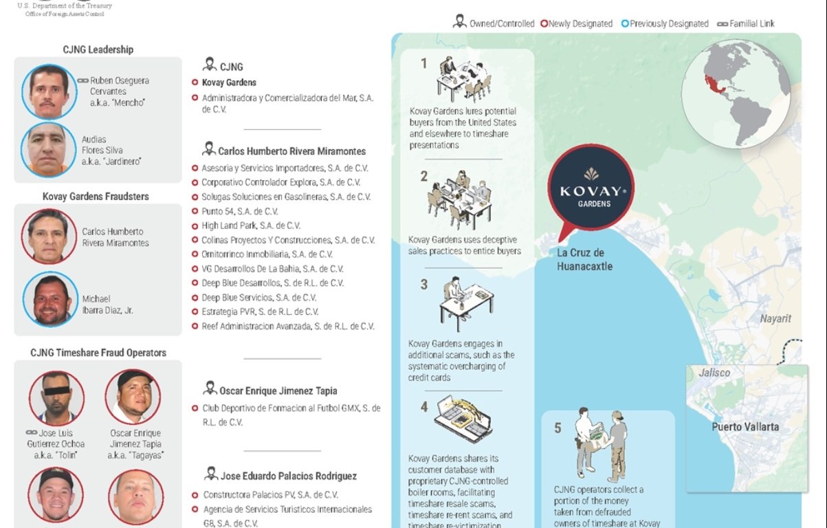WASHINGTON.— El Departamento del Tesoro de Estados Unidos, a través de la Oficina de Control de Activos Extranjeros (OFAC), anunció sanciones contra una red de fraude de tiempo compartido que atribuye al Cártel Jalisco Nueva Generación (CJNG). La acción incluye al resort mexicano Kovay Gardens, a cinco personas y 17 empresas en México, varias con operaciones en o cerca de Puerto Vallarta, según el comunicado oficial.