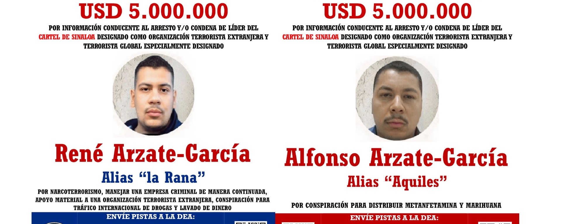 El Departamento de Estado de Estados Unidos anunció recompensas de hasta 10 millones de dólares por información que lleve al arresto y/o condena de dos presuntos jefes de plaza del Cártel de Sinaloa en Tijuana, identificados como René Arzate-García, alias “La Rana”, y su hermano Alfonso Arzate-García, alias “Aquiles”.
