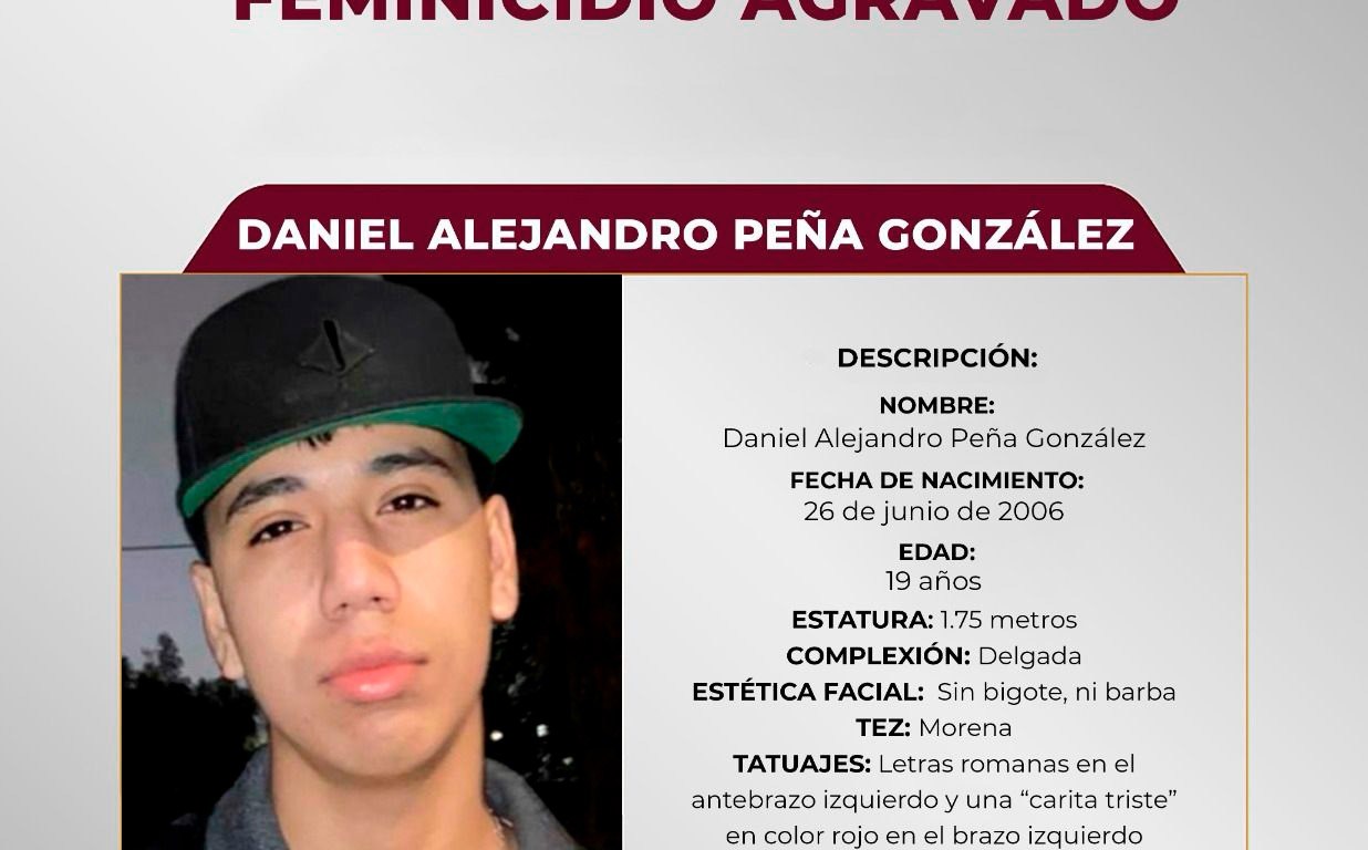 TIJUANA. La Fiscalía General del Estado (FGE) solicitó el apoyo de la ciudadanía para localizar a Daniel Alejandro Peña González, de 19 años, quien cuenta con una orden de aprehensión por su presunta responsabilidad en el delito de feminicidio agravado.